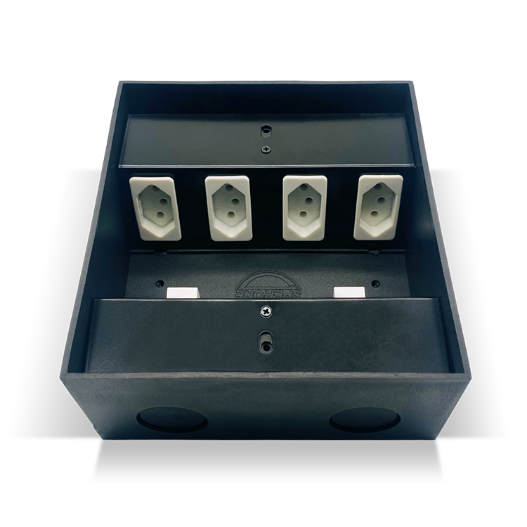 Caixa de tomadas com quatro pontos elétricos e quatro pontos de dados, para instalação em contrapiso.