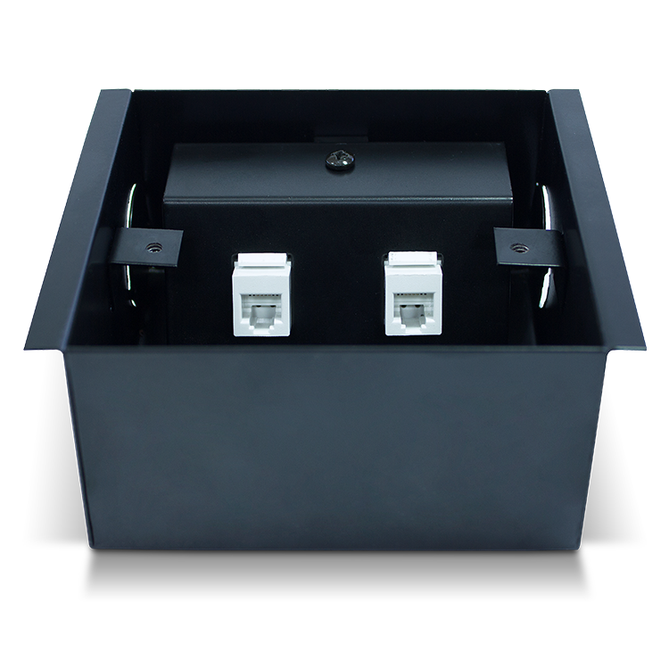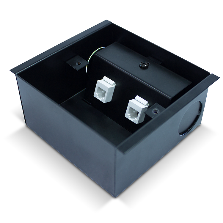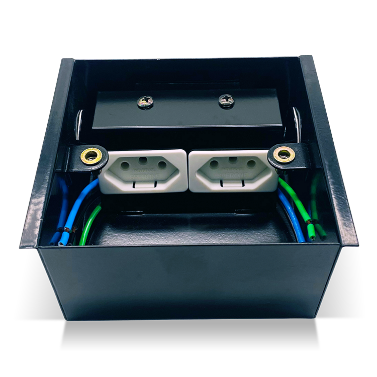 Caixa de tomadas com pontos de conexão elétrica e pontos de conexão de dados para instalação em piso elevado e contrapiso. O número de conexões de cada categoria é elegível, sendo o total da caixa de dois pontos de conexão.