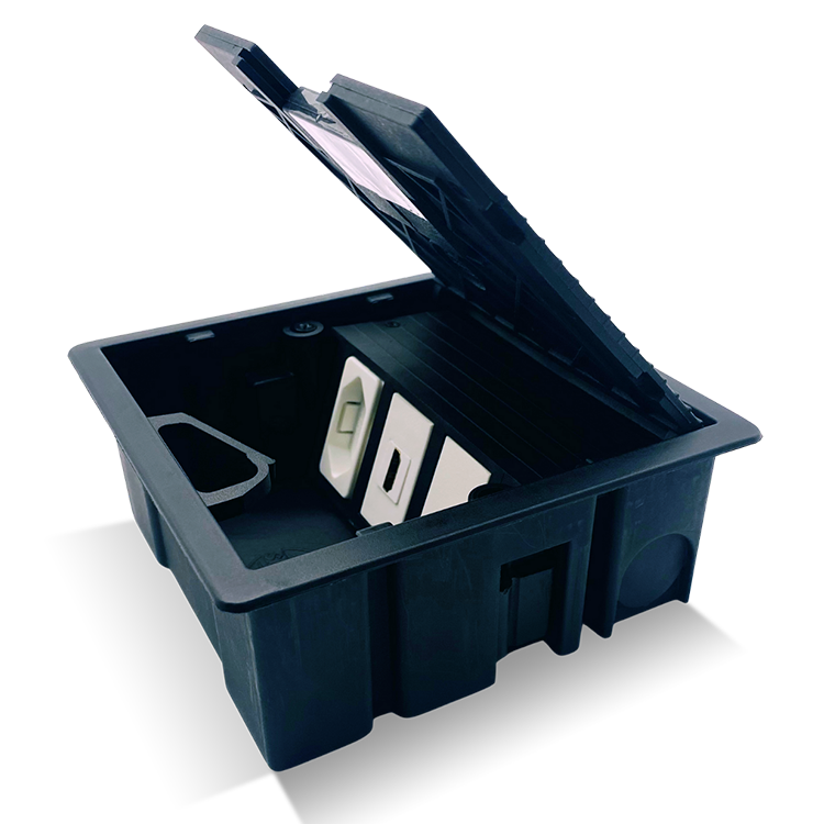 Caixa de tomadas SPERONE, com três conexões modulares, para instalação em piso elevado, contrapiso, mobiliário e drywall.